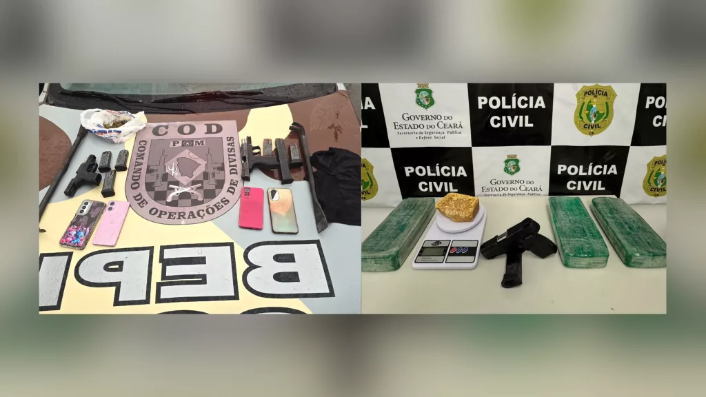 Momentos depois, agentes da 2ª Seccional Interior Sul entraram com um cão farejador. Dentro de um balde enterrado, estava a terceira pistola .40 e os 3 kg de crack, reforçando o indício de distribuição em larga escala, prática que, segundo o Atlas da Violência 2023, impulsiona estatísticas de homicídios no Ceará.