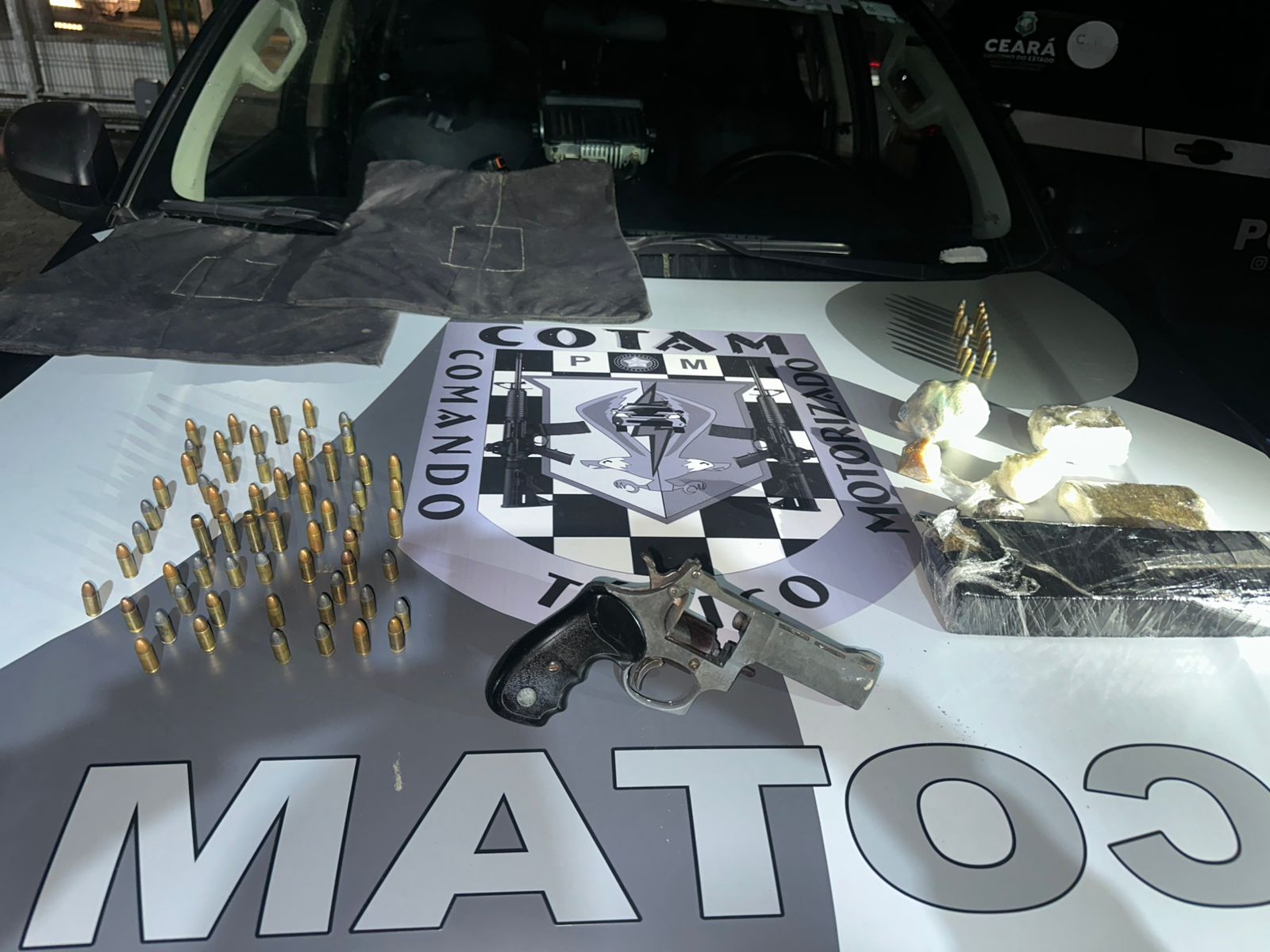 Foram recolhidos 1,060 kg de maconha, 98 g de cocaína, 51 g de crack, 80 munições e um revólver calibre .38, além de duas placas balísticas.