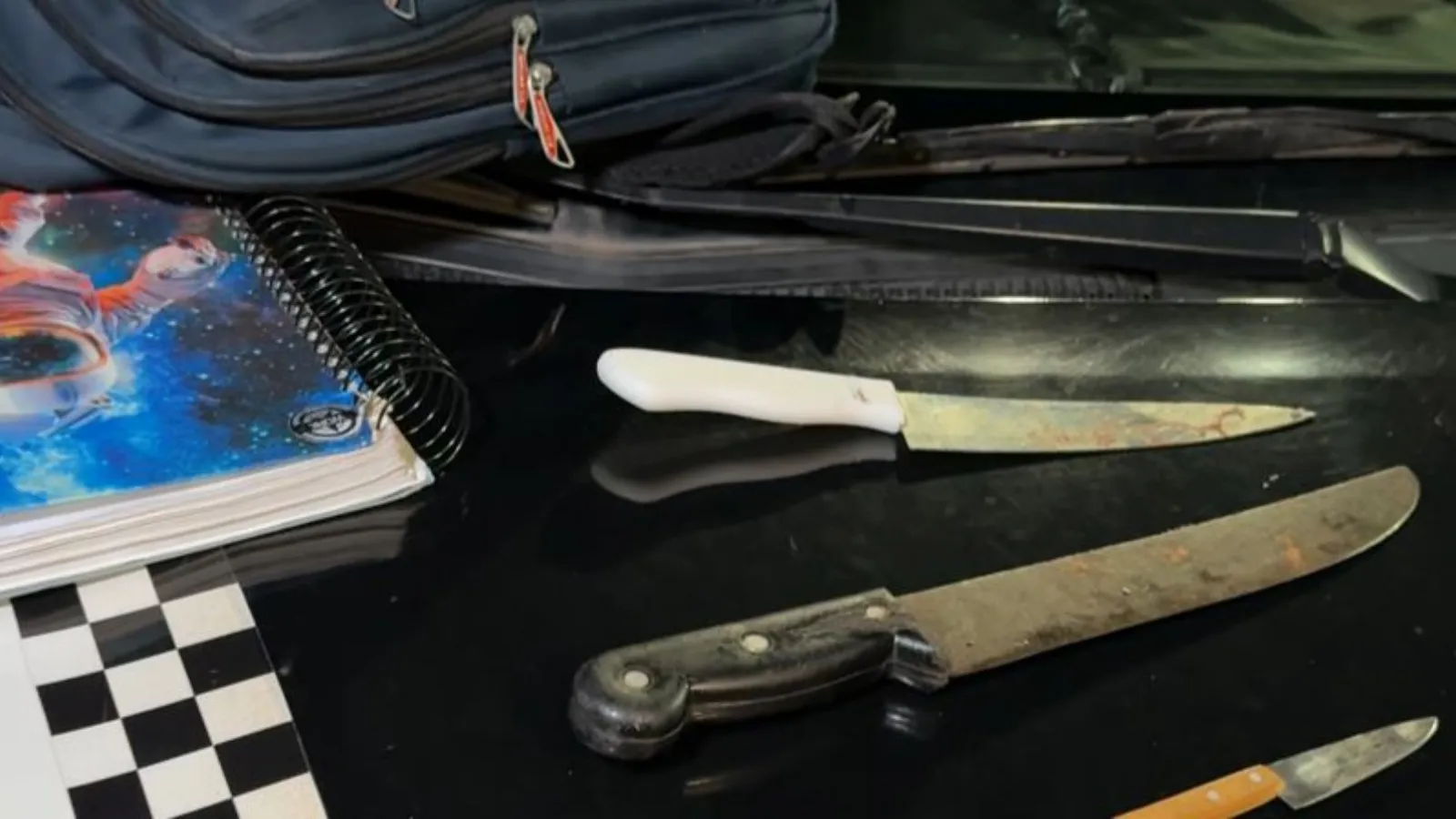 A Polícia Militar localizou o adolescente minutos depois fora da escola. Dentro da mochila, estavam três lâminas apreendidas, confirmando a premeditação do ato.