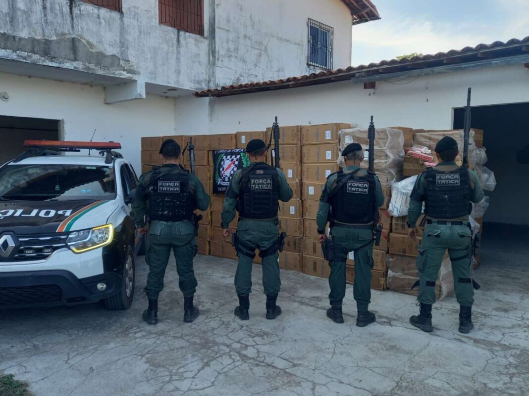 Apreensão de 245 caixas de cigarros em Pacajus, diz PM – Na tarde de domingo (12), a Força Tática do 25º Batalhão da Polícia Militar do Ceará localizou 245 caixas e 41 maços de cigarros armazenados em um galpão vazio no bairro Tiririca, em Pacajus.
