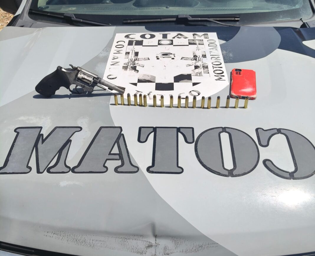 Durante a revista, os agentes encontraram o revólver calibre .38, marca Taurus, além de 18 munições do mesmo calibre escondidas em um ponto indicado pelo próprio detido.