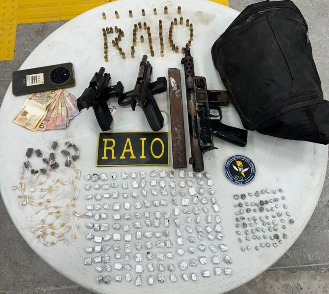 A operação resultou na prisão de um homem de 26 anos que portava uma metralhadora artesanal calibre 9 mm, duas pistolas (calibres .380 e .40), 120 papelotes de crack, 155 de maconha, um celular, uma bolsa e R$ 135 em espécie.