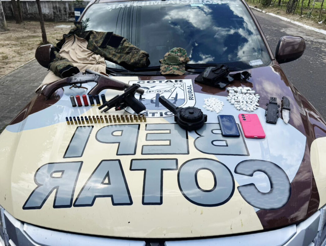 Miraíma, CE – Na manhã de 3 de fevereiro, por volta das 6h, uma operação relâmpago do Batalhão Especializado em Policiamento do Interior (BEPI) da Polícia Militar do Ceará desarticulou uma suposta base de facção no distrito de Brotas e impediu a fuga de suspeitos fortemente armados.