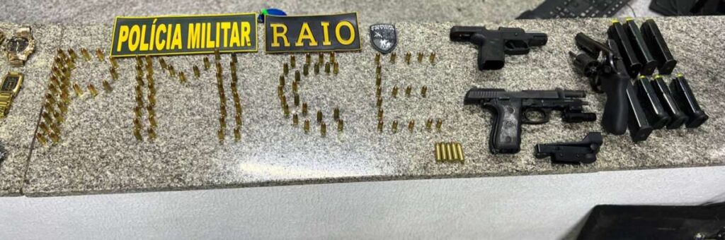 Os militares atenderam à ocorrência de perturbação de sossego. Com a entrada autorizada pelo responsável pelo imóvel, a patrulha localizou duas pistolas 9 mm, um revólver calibre .38, sete carregadores, um acessório de mira headshot, seis celulares, quatro relógios de ouro e um carro.