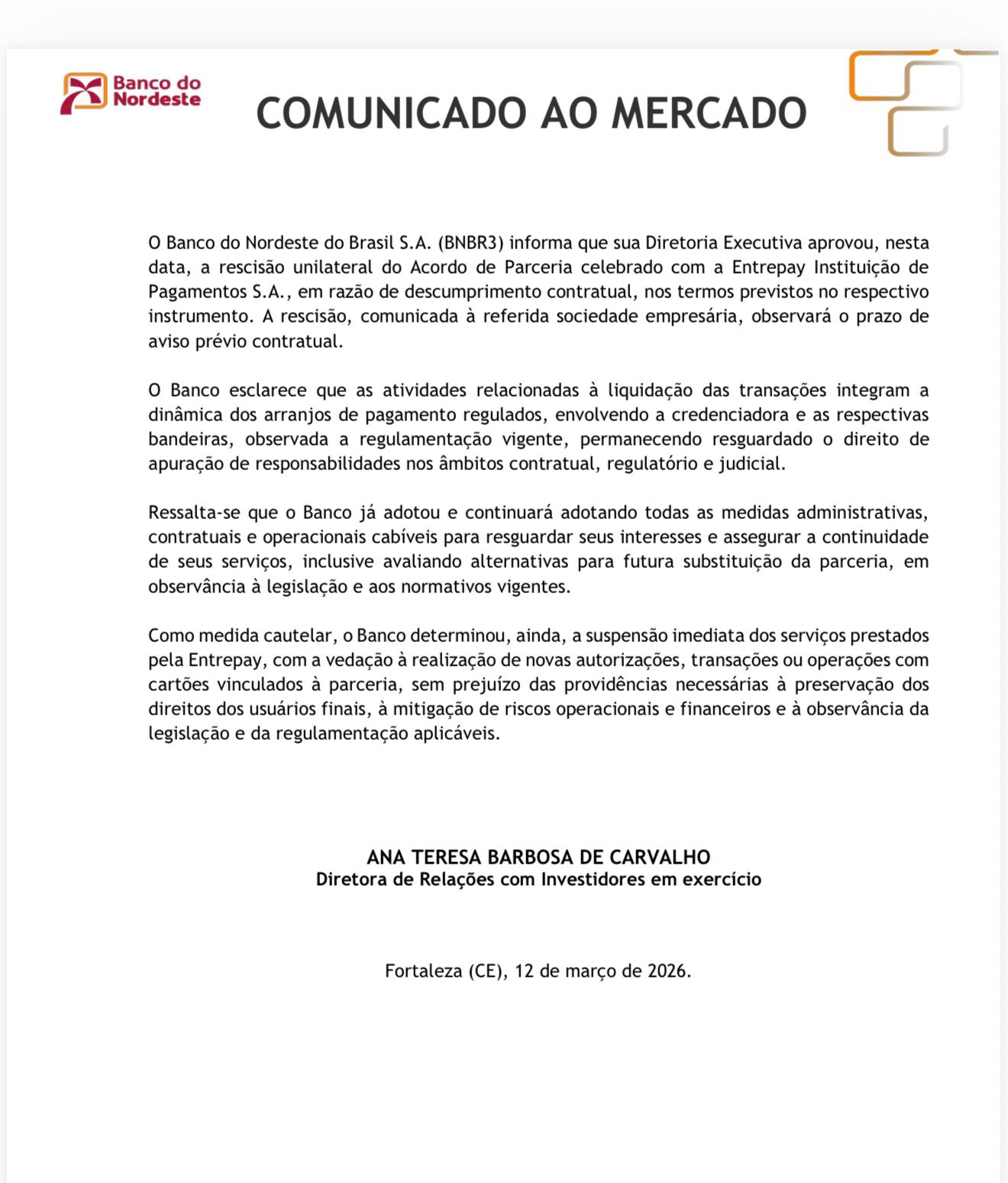 - Em resumo: Diretoria do BNB cancelou a parceria e suspendeu imediatamente novas transações nos terminais da Entrepay.