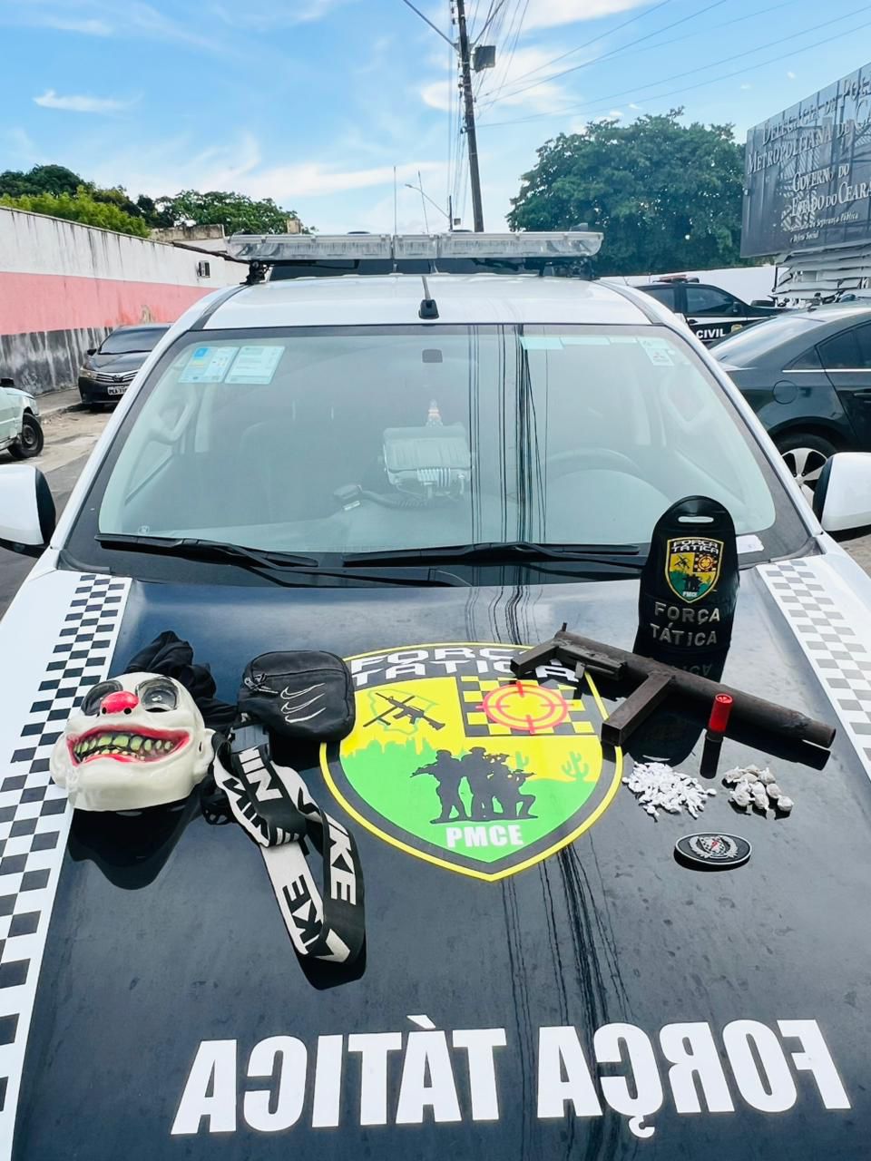 Segundo a corporação, o confronto começou por volta das 15h, na Travessa das Dunas, área que faz divisa com o turístico Cumbuco. Quando viram a viatura, três homens encapuzados pularam muros, invadiram casas vazias e se embrenharam em terrenos arenosos. A busca tática terminou com a localização da espingarda improvisada, oito gramas de maconha, seis gramas de crack e uma máscara – indícios de que o grupo planejava novas ações.