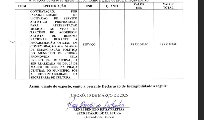 CHORÓ/CE – No próximo dia 27 de março, a pequena cidade cearense vai celebrar 34 anos de emancipação política com um cachê de R$ 450 mil para o cantor Tarcísio do Acordeon, valor integralmente pago com recursos próprios da prefeitura e já alvo de críticas sobre prioridades orçamentárias.
