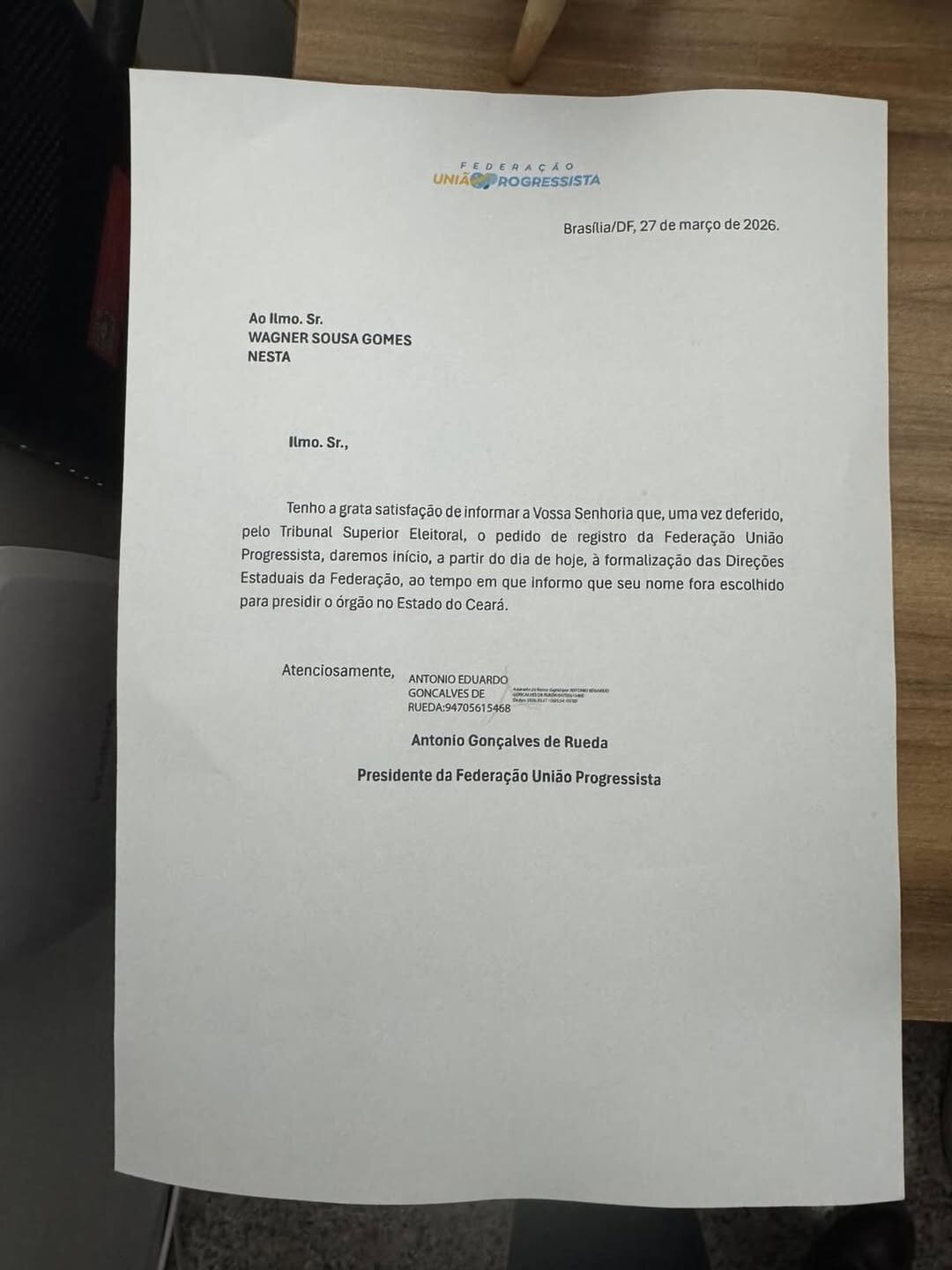 FORTALEZA/CE – Um ofício assinado nesta sexta-feira (27) pelo presidente nacional do União Brasil, Antônio Rueda, confirmou Capitão Wagner como novo presidente da Federação União Progressista no Ceará, encerrando semanas de especulações e reposicionando a oposição local com vistas às eleições de 2026.