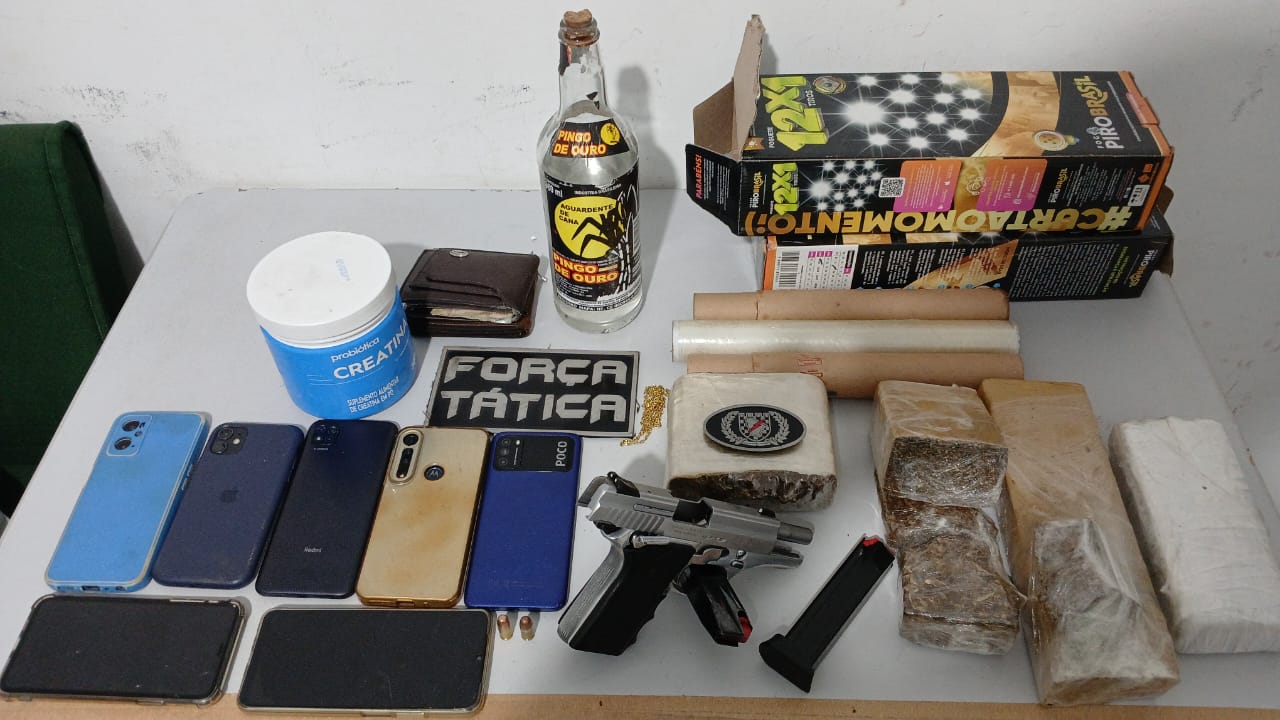 Durante a busca, a pistola foi encontrada sobre uma geladeira. Também foram recolhidos sete celulares, R$ 325 em espécie, material para embalar entorpecentes, uma garrafa de “loló”, fogos de artifício e dois veículos.