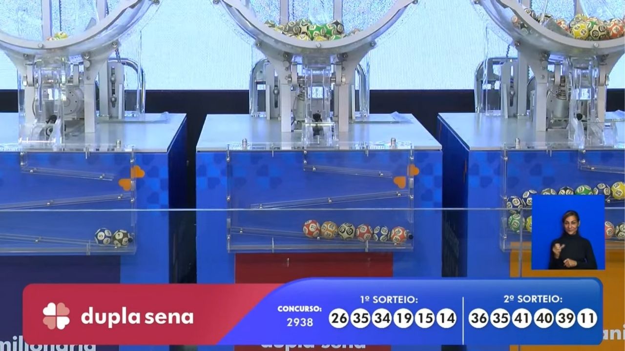 O bilhete da Dupla dá direito a dois sorteios com a mesma combinação. No 1º, saíram 15 – 14 – 19 – 26 – 34 – 35; no 2º, 11 – 35 – 36 – 39 – 40 – 41.