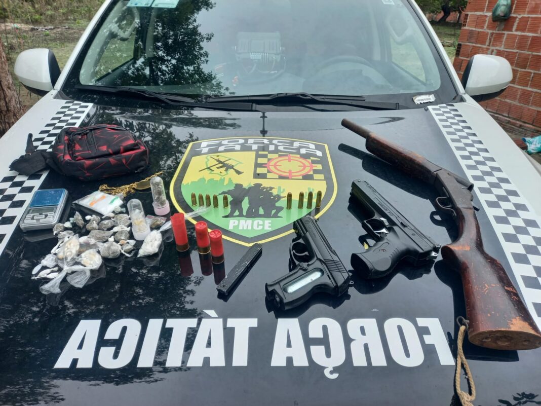 Horizonte (CE) – A Força Tática do 25º Batalhão da Polícia Militar surpreendeu, na tarde desta quinta-feira (5), um rapaz de 18 anos que tentou fugir ao notar a viatura no bairro Dourados. A breve perseguição terminou com a apreensão de uma espingarda calibre 12, munições e porções de maconha, cocaína e crack, reforçando o alerta para armas de grosso calibre em circulação no município.