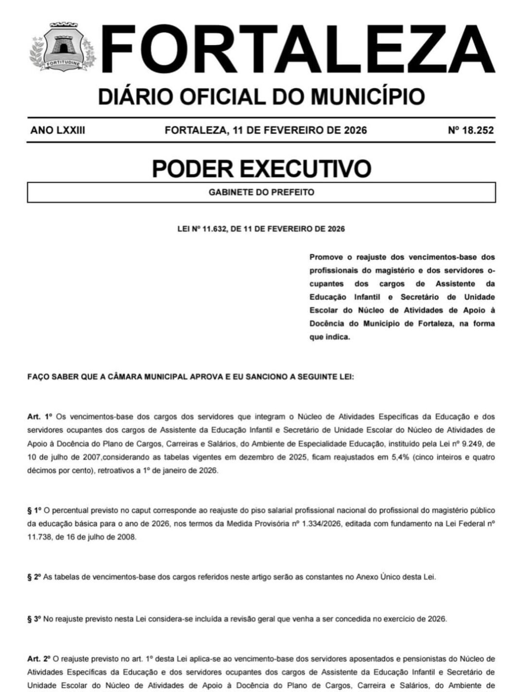 Fortaleza/CE – Na última quarta-feira (11), o prefeito Evandro Leitão sancionou, no Diário Oficial do Município, o reajuste de 5,4% no piso dos profissionais da educação. A nova referência salarial – retroativa a 1º de janeiro – passa de R$ 4.867,77 para R$ 5.130,63 por 40 horas semanais, impactando diretamente mais de 14 mil servidores entre efetivos e substitutos.