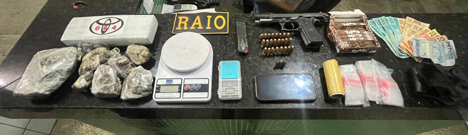- Em resumo: prisão de um suspeito com arma de uso restrito, quase 2 kg de droga, munições e material para embalar entorpecentes.