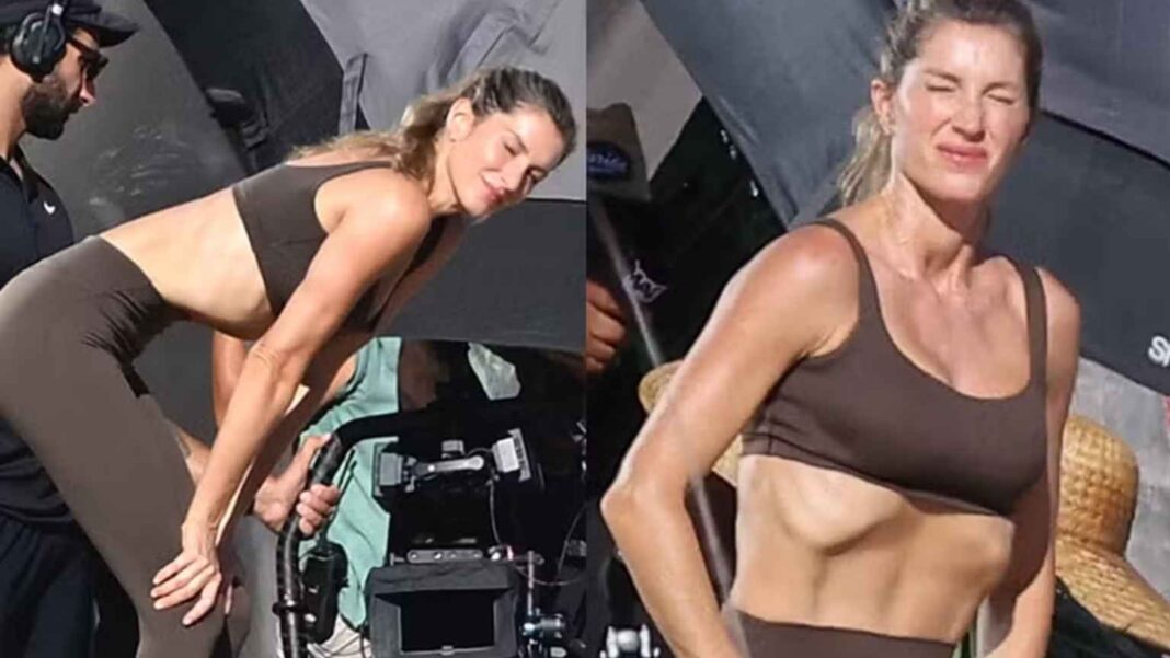 Nas imagens, Bündchen usa um top esportivo preto e legging cinza, exibindo flexibilidade em posições avançadas e um abdômen marcado que chamou a atenção de quem passava pelo local.