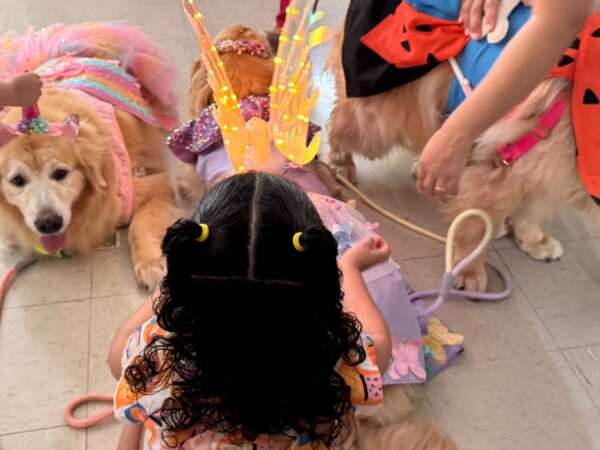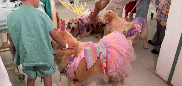 Golden retrievers fantasiadas levam alegria a hospital de Fortaleza