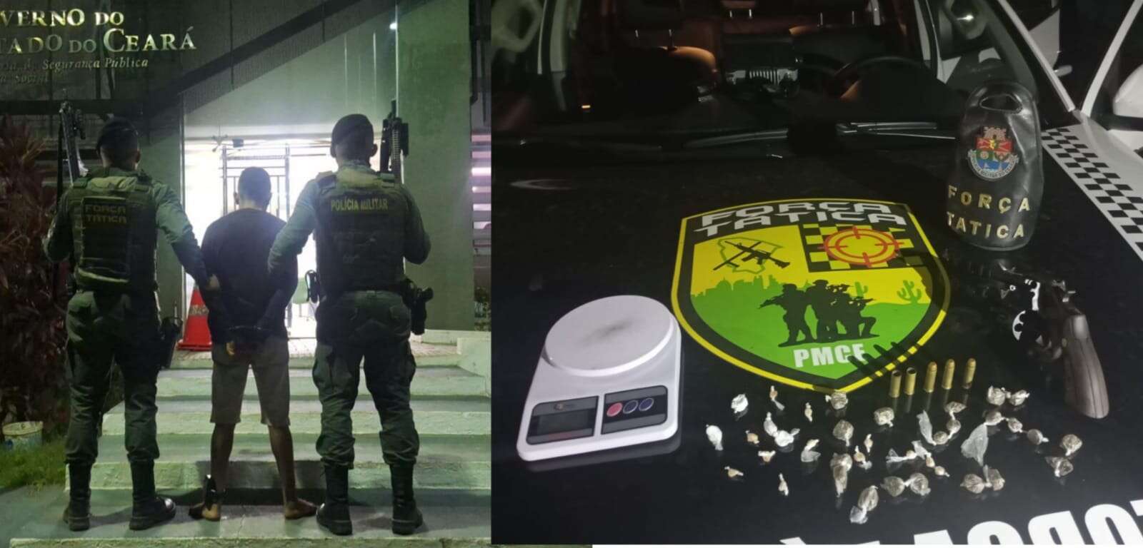 Com o suspeito, os policiais apreenderam um revólver calibre .38, munições intactas e deflagradas, além de porções de maconha, cocaína, crack e uma balança de precisão. Todo o material foi levado para a Delegacia Regional de Baturité, onde o detido foi autuado por tráfico de drogas e porte ilegal de arma de fogo.