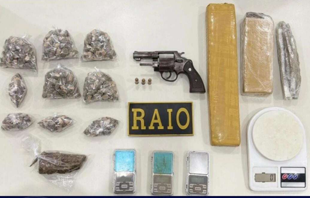 “No interior, encontraram um revólver calibre .38 com quatro munições, duas facas, quatro balanças de precisão e 2,05 kg de maconha.”
