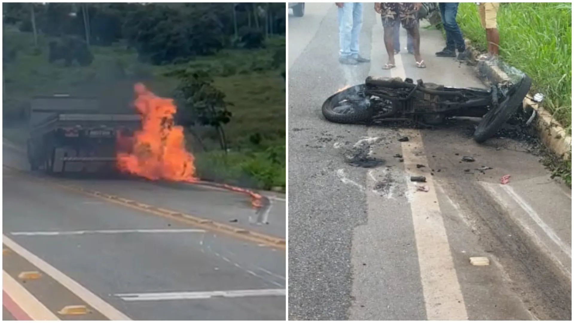 - Em resumo: moto incendiou-se após o tanque romper; caminhoneiro fugiu sem prestar socorro.