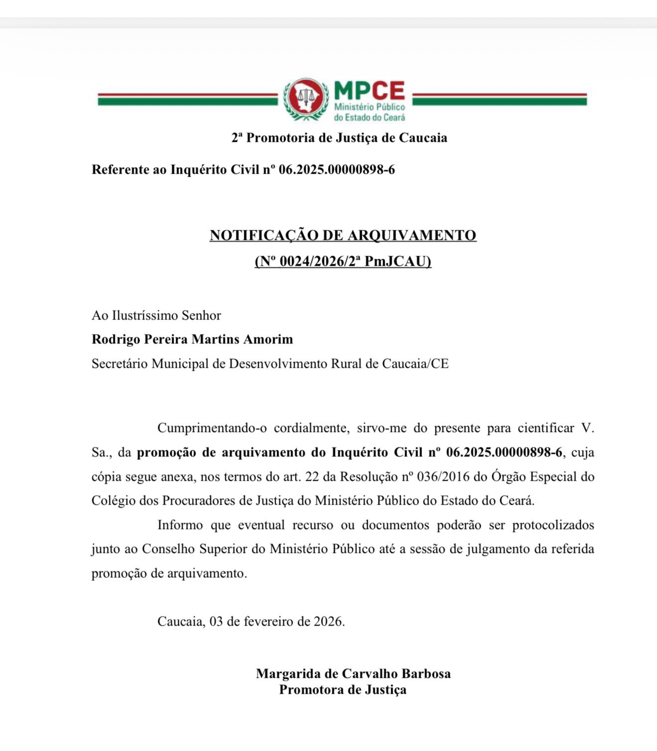 CAUCAIA (CE) – O Ministério Público do Estado do Ceará (MPCE) arquivou o inquérito que pedia o afastamento do secretário de Desenvolvimento Rural, Rodrigo Amorim, investigado por suposto nepotismo por ser filho do prefeito Naumi Amorim. A promotora Margarida de Carvalho Barbosa concluiu que não há provas suficientes para manter a apuração, encerrando temporariamente a controvérsia.