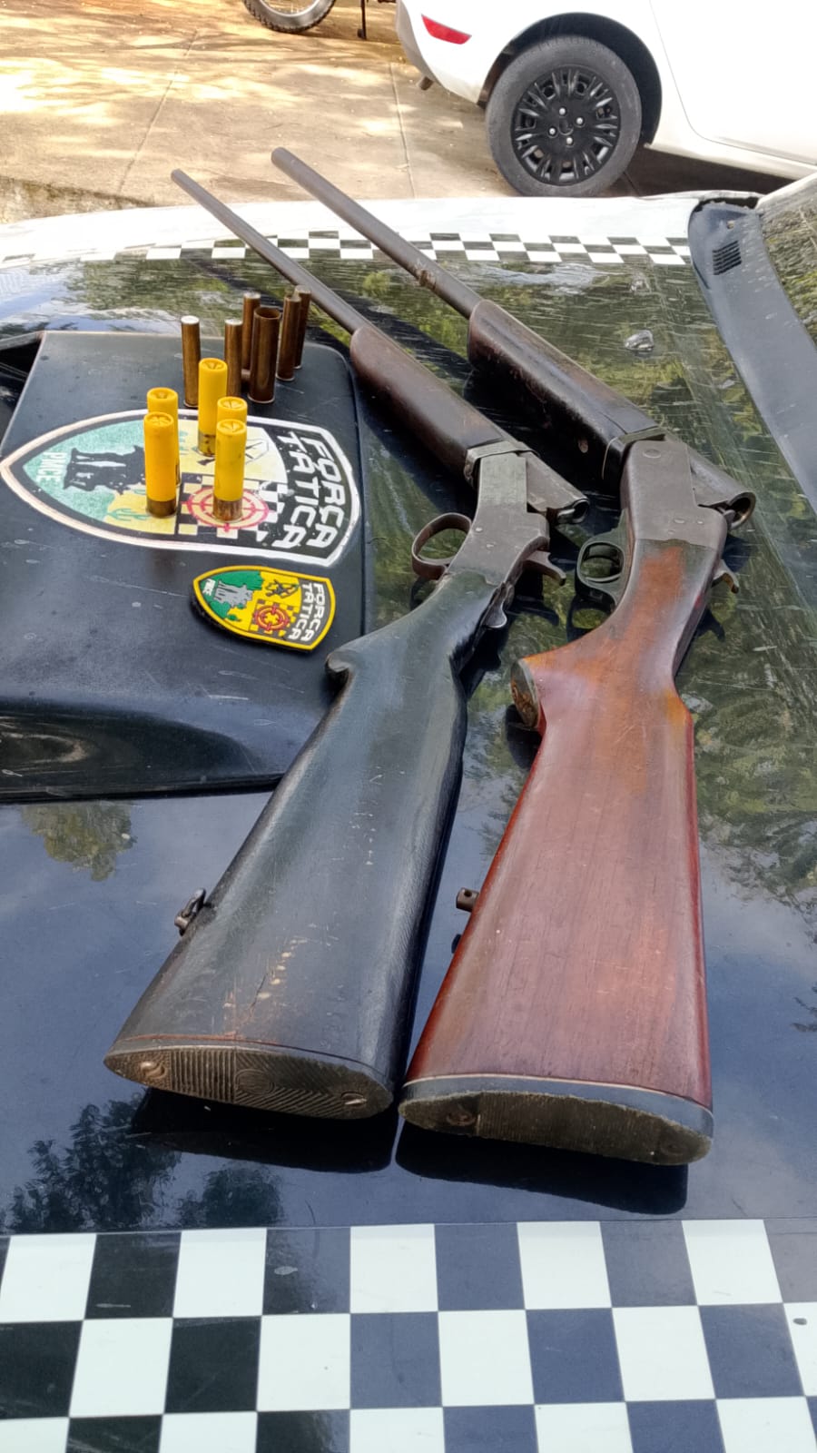 - Em resumo: suspeitos fugiram de moto e largaram espingardas calibre 20 e 36 com munição.