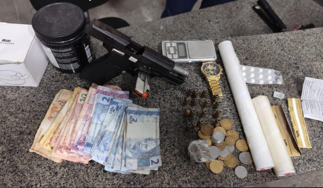 - Em resumo: arma de fogo, 95 g de entorpecentes e dinheiro recuperados; criminoso segue foragido.