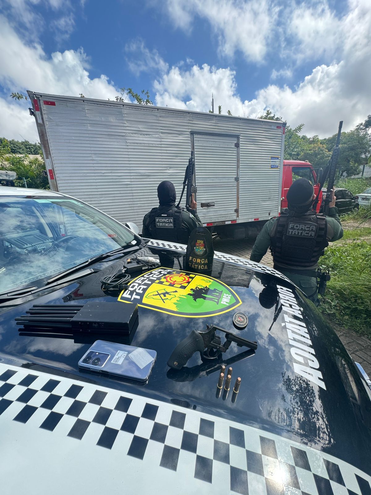 Segundo a PM, o suspeito – já fichado por ataques a transportadoras – saltou da cabine ao notar a viatura. Mesmo armado, preferiu correr: atravessou muros, invadiu uma empresa e desapareceu em área de mata rumo ao bairro Paupina. No caminho, arremessou um revólver calibre .38, cinco munições, um celular e um jammer capaz de bloquear rastreadores.