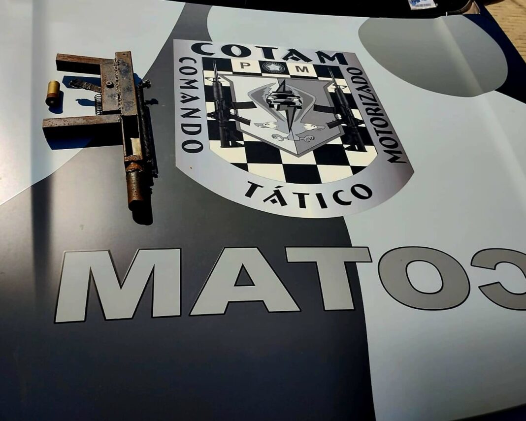 Durante patrulhamento, os militares visualizaram o suspeito e realizaram a abordagem preventiva. A arma foi encontrada em uma área de matagal a poucos metros do local, municiada com um cartucho intacto.