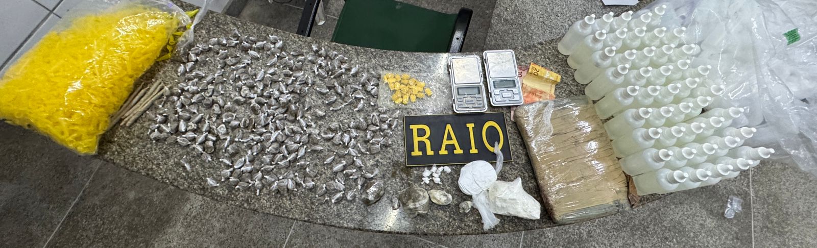 Com o suspeito, os policiais do Comando de Policiamento de Rondas de Ações Intensivas e Ostensivas (CPRaio) apreenderam 100 g de cocaína, 750 g de maconha, 25 comprimidos de ecstasy, 44 frascos de “loló”, duas balanças de precisão, embalagens e R$ 30 em dinheiro.