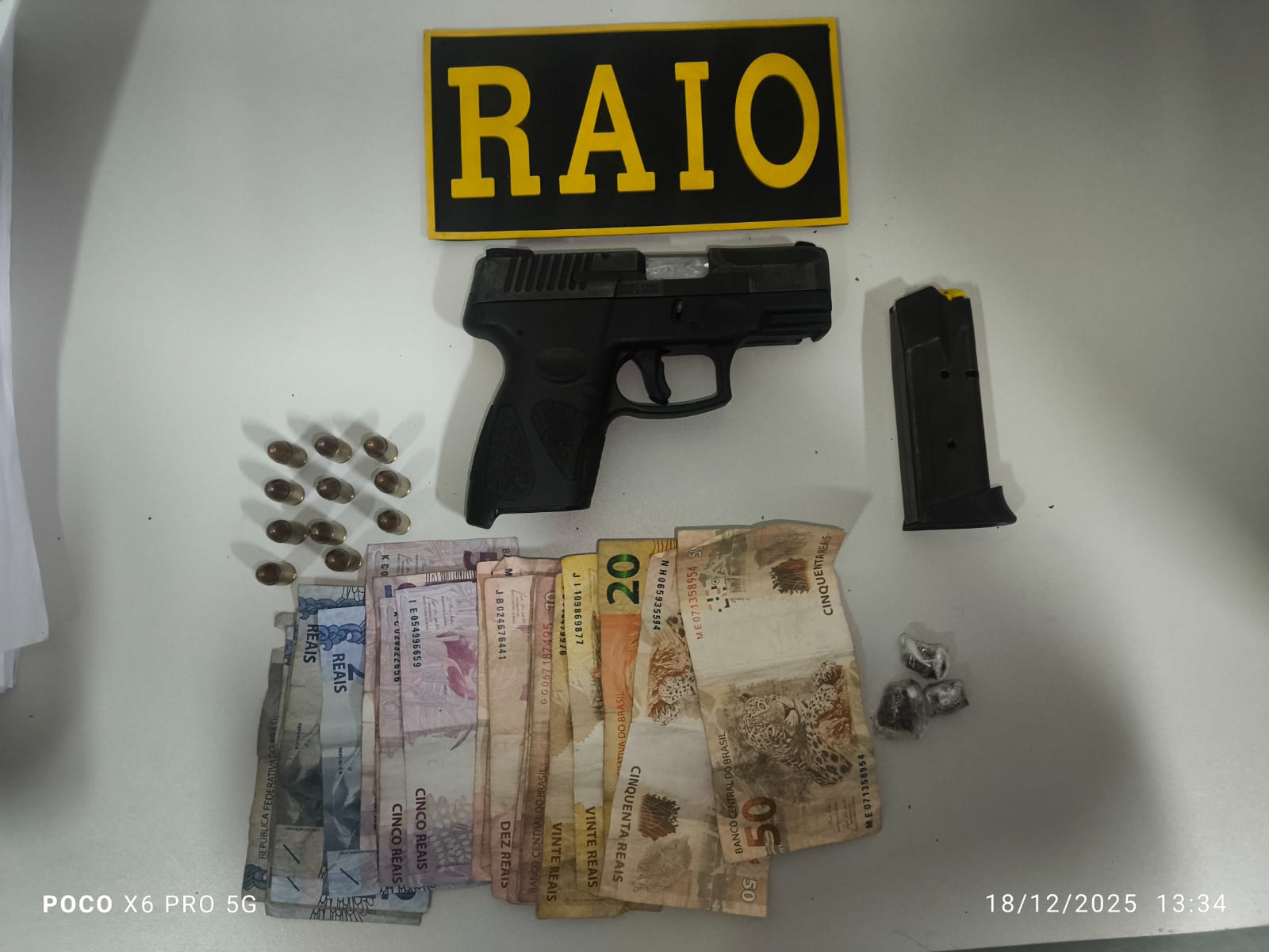 Os raianos localizaram a dupla no ponto indicado e realizaram busca pessoal e varredura no entorno. Na árvore citada, estavam a arma, a droga e o dinheiro. Ambos receberam voz de prisão imediatamente.