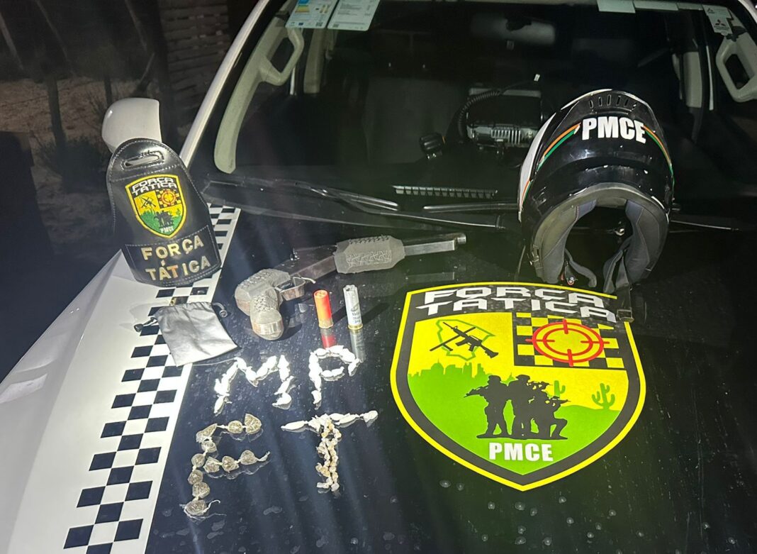 Equipes da 2ª Companhia do 12º Batalhão da Polícia Militar do Ceará (PMCE) localizaram e apreenderam uma espingarda calibre 12, munições e diversas porções de drogas na noite de quinta-feira, 5 de fevereiro, no bairro Tabuba, em Caucaia, Região Metropolitana de Fortaleza.