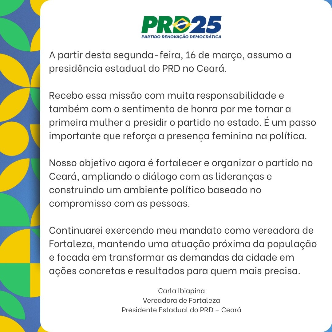 FORTALEZA/CE – Na última segunda-feira (16), a vereadora Carla Ibiapina quebrou um tabu ao tornar-se a primeira mulher a presidir o PRD no Ceará, passo considerado estratégico para a sigla a poucos meses das eleições municipais.