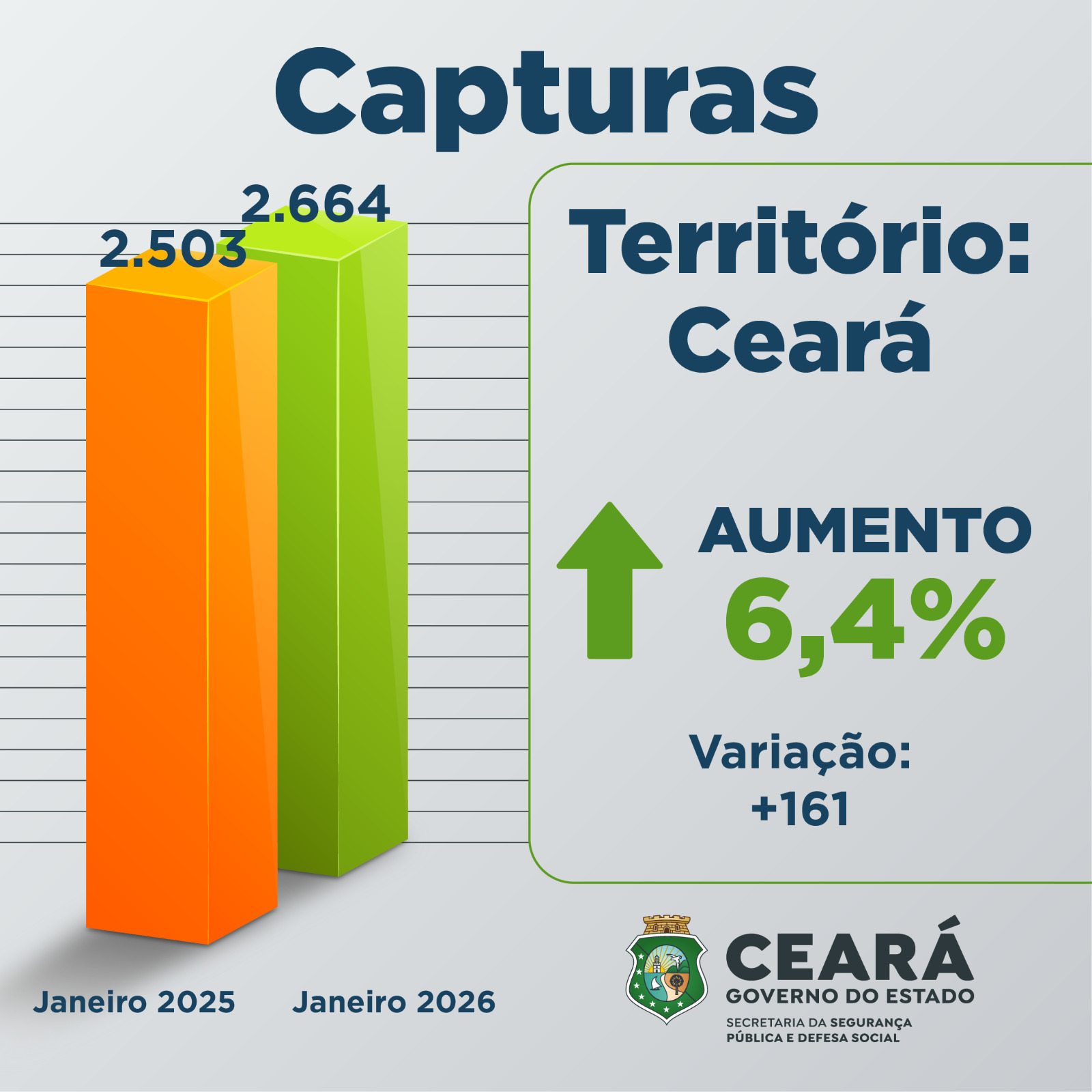 Fortaleza/CE – Dados da Superintendência de Pesquisa e Estratégia de Segurança Pública (Supesp) mostram que, em janeiro de 2026, o Ceará prendeu 160 suspeitos de integrar organizações criminosas, alta de 113,3 % ante o mesmo mês do ano passado. No total, foram 2.664 capturas em flagrante ou por mandado, avanço de 6,4 %.