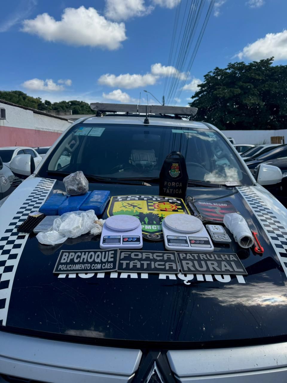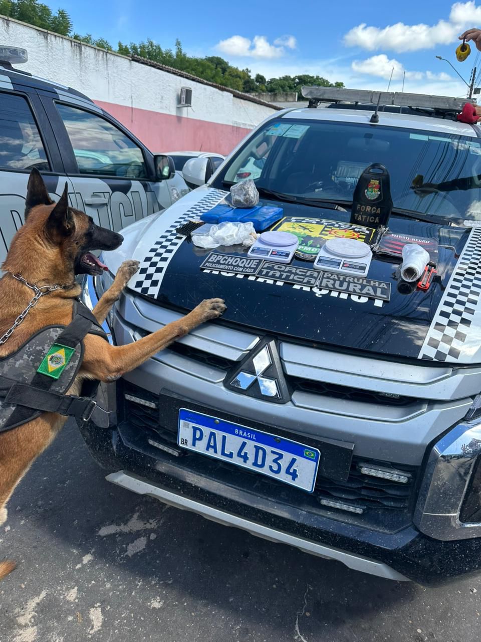 Dois cães farejadores do BPChoque varreram a área externa. A poucos metros da porta, eles sinalizaram um ponto no matagal. Ali, um tambor plástico enterrado escondia 1.994 g de maconha, 172 g de cocaína e 22 g de crack, além de quatro balanças de precisão e insumos para embalo.