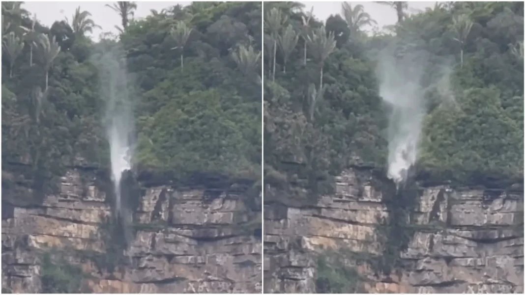 Ubajara/CE – Um vídeo gravado em 11 de março de 2026, no Parque Nacional de Ubajara, expôs um fenômeno que virou assunto nas redes: a água de uma cachoeira sendo empurrada para cima, ao contrário da gravidade, por fortes rajadas de vento.