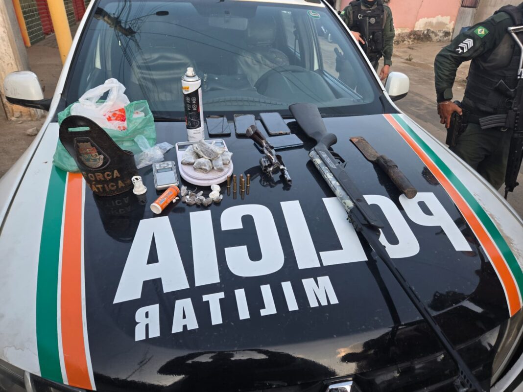 No interior da residência, os militares encontraram um revólver calibre .38 com cinco munições intactas, um estojo deflagrado, uma espingarda de pressão, quatro celulares, duas balanças de precisão, além de cinco papelotes de cocaína e 24 porções de maconha — sendo cinco tabletes que totalizam 117 gramas.