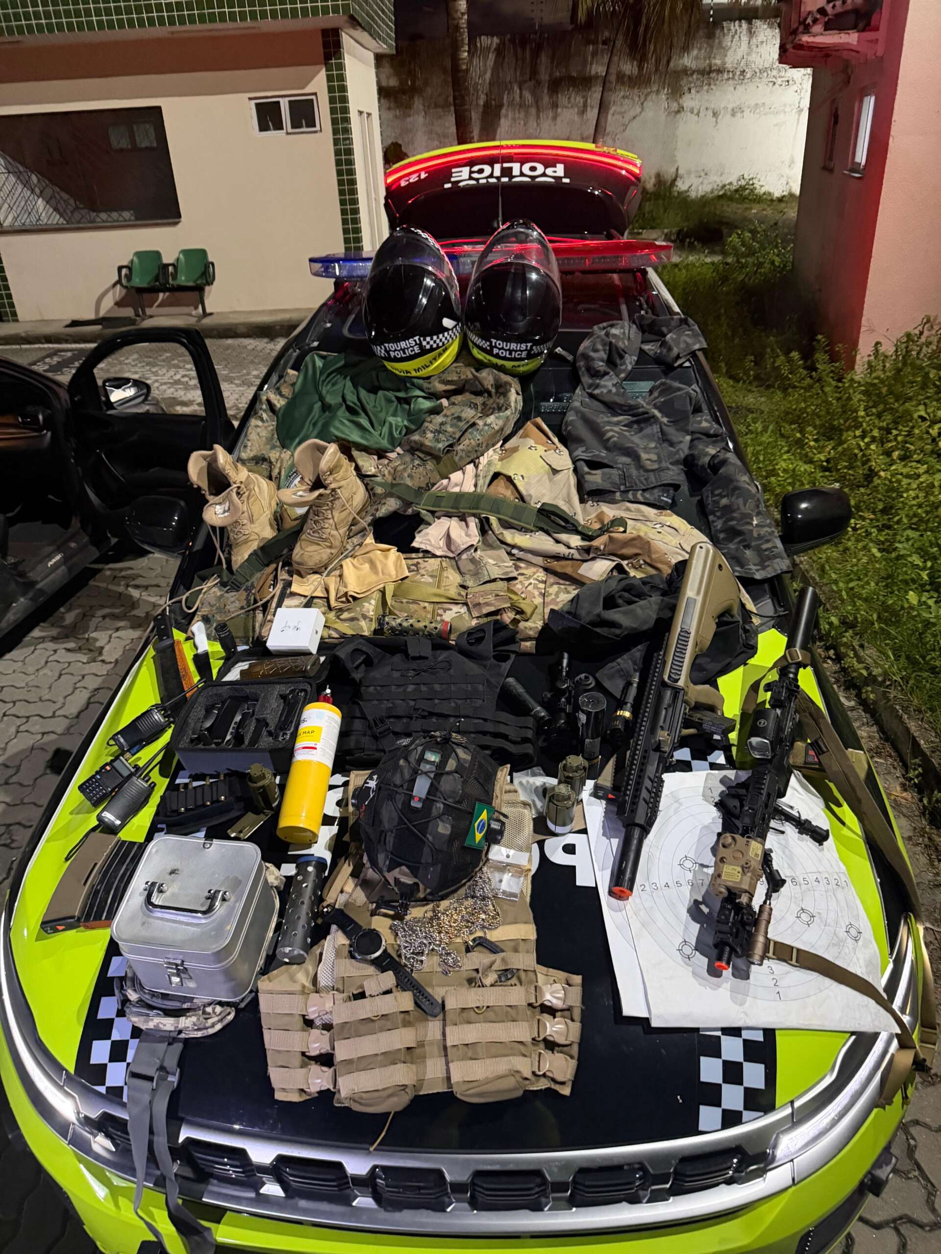 No mesmo quarteirão, o veículo usado na fuga estava estacionado em frente a uma residência. Com permissão do morador, os policiais entraram e encontraram rádios comunicadores, equipamentos de airsoft, munição calibre 38, facas táticas, joias e roupas camufladas.