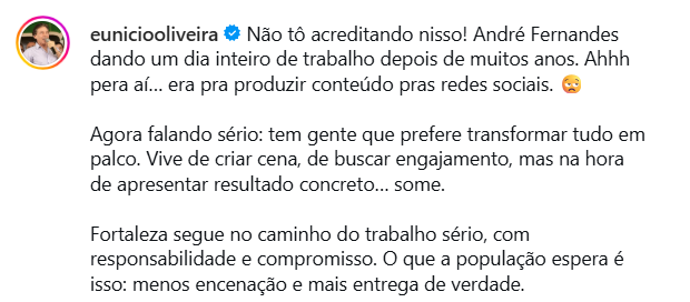 Segundo o próprio deputado, os resíduos foram recolhidos em uma praça de Fortaleza durante ação de limpeza voluntária. Ele alega que, como o caminhão de coleta “não passa há dias”, decidiu levar o material até a sede da Prefeitura para chamar atenção do prefeito. Dados da Câmara dos Deputados mostram que Fernandes tem usado as redes sociais como principal arena de mobilização de base.