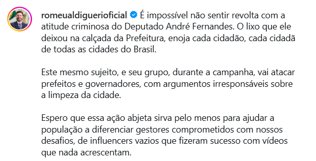 “Não é jogando lixo em prédio público que se resolve a questão da limpeza urbana”, criticou Jade Romero em vídeo divulgado na manhã de sexta-feira.
