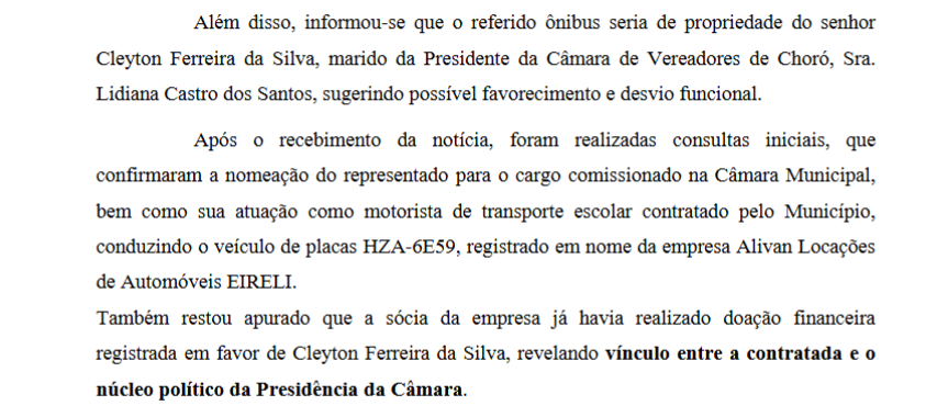 O ônibus escolar envolvido pertence ao empresário Cleyton Ferreira da Silva, o “Cabeça do Choró”, casado com a vereadora Lidiana Castro, ex-presidente da Câmara. Para o MPCE, o vínculo familiar sugere favorecimento político. Além da devolução de valores, a Promotoria pede multa de até R$ 52 mil, perda de função e suspensão dos direitos políticos por até 16 anos.