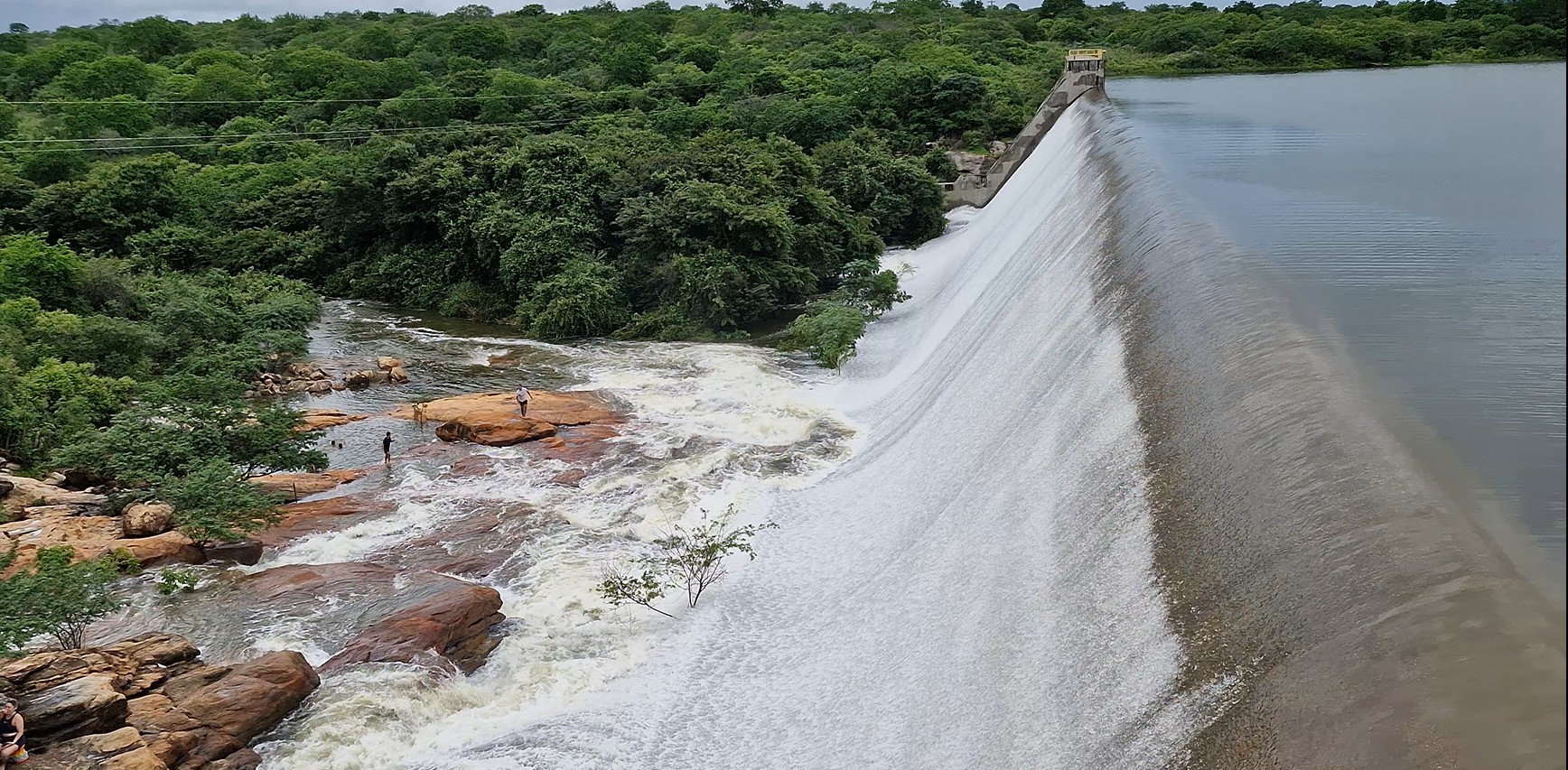 FORTALEZA/CE – Dados atualizados nesta quarta-feira, 4 de março de 2026, mostram que sete açudes cearenses estão sangrando simultaneamente, após um aporte recorde de 75,3 milhões de m³ em apenas 24 horas, elevando o volume total de água armazenada no estado para pouco mais de 40% da capacidade.