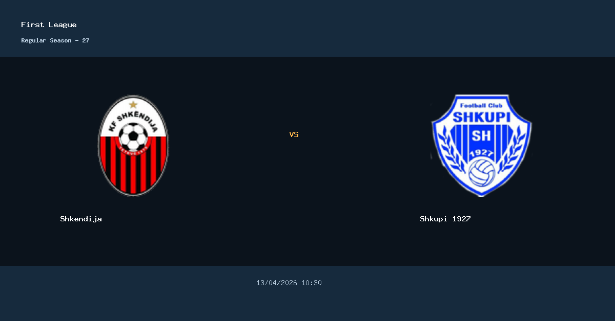 As equipes Shkendija e Shkupi 1927 medem forças pela 27ª rodada da First League da Macedônia nesta segunda-feira, 13/04/2026. O duelo começa às 10h30 (horário de Brasília, UTC-3) e integra a fase regular do torneio nacional, que reúne os principais clubes do país em turno e returno.
