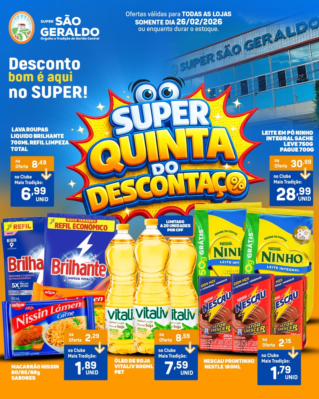 Super São Geraldo – Na quinta-feira, 26 de fevereiro, a rede realiza mais uma edição da SUPER QUINTA DO DESCONTAÇO, ação que deve movimentar clientes de várias regiões e pressionar o fluxo nas lojas locais ao oferecer descontos pontuais em diferentes setores.