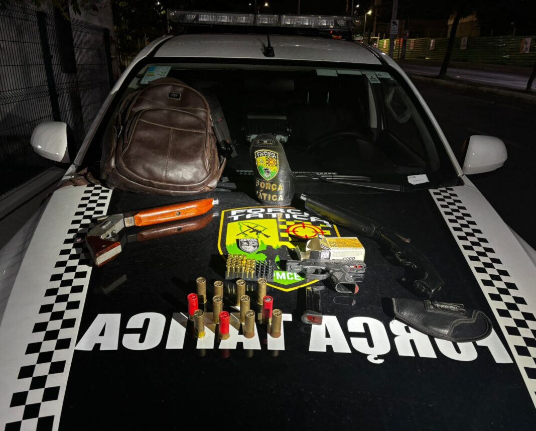 Com ele, a PMCE apreendeu uma pistola 9 mm municiada, duas espingardas artesanais calibre 12 e dezenas de cartuchos de diferentes calibres.