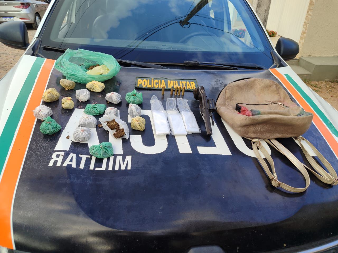 O revólver estava com a numeração suprimida e municiado, enquanto a droga foi encontrada dentro de uma mochila que o homem carregava.