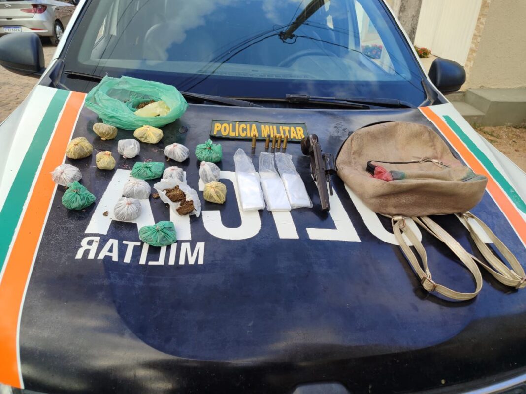 O revólver estava com a numeração suprimida e municiado, enquanto a droga foi encontrada dentro de uma mochila que o homem carregava.