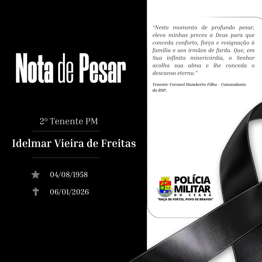 Tenente da PMCE morre aos 67 anos; corporação lamenta – A morte do 2º Tenente Ildemar Vieira de Freitas, 67, foi confirmada pela Polícia Militar do Ceará (PMCE) na última terça-feira (6 de janeiro de 2026).