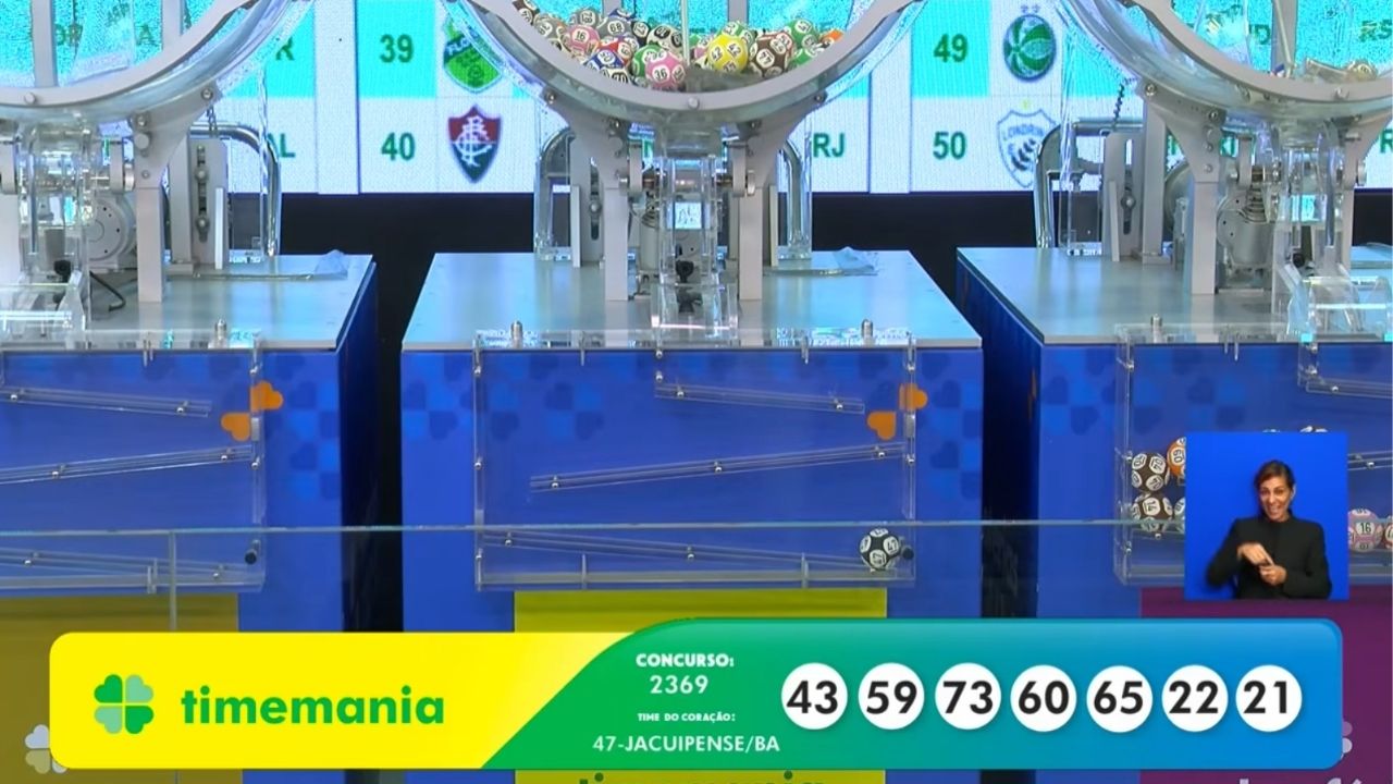Os números sorteados foram 21 – 22 – 43 – 59 – 60 – 65 – 73. Já o Time do Coração saiu para o Jacuipense, da Bahia. A Caixa Econômica Federal divulga, nas próximas horas, a divisão de prêmios entre vencedores e a estimativa para o próximo concurso. Segundo levantamento do Banco Central, loterias como a Timemania injetam mais de R$ 17 bilhões por ano na economia brasileira em arrecadação e repasses sociais.