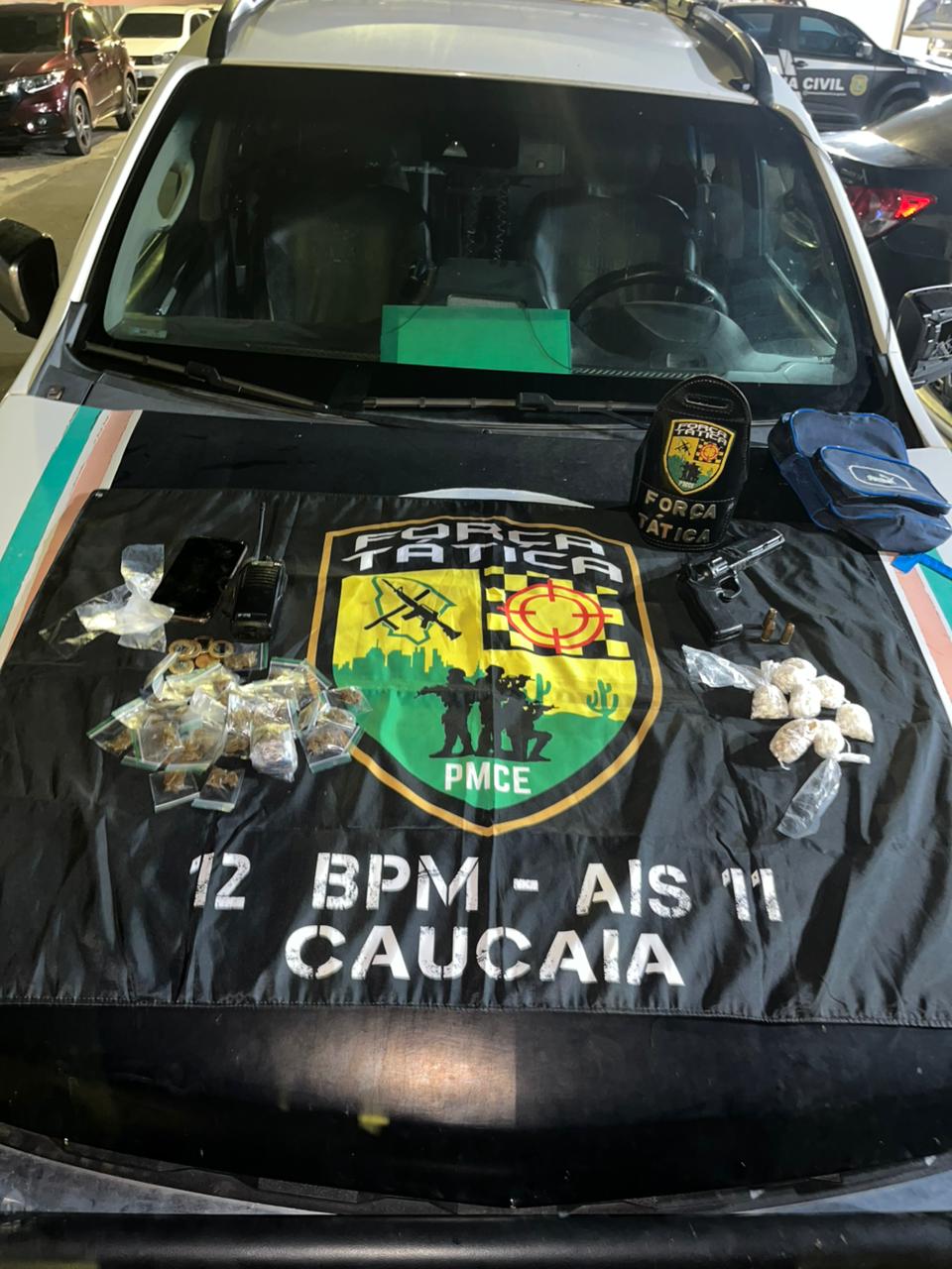 Também foram recolhidos R$ 26,05 em espécie, três munições calibre .40, um simulacro de revólver e um aparelho celular. Todo o material foi levado à Delegacia Metropolitana de Caucaia, onde a mulher foi autuada por tráfico e associação para o tráfico, além de posse irregular de munição.