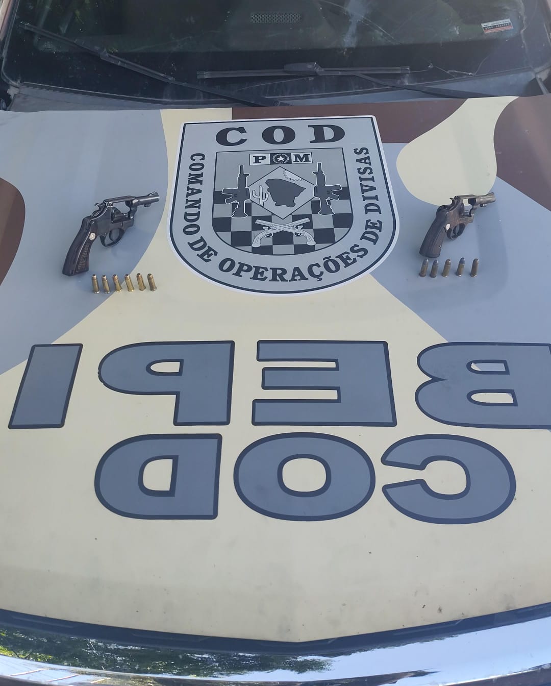 “Durante a busca pessoal, foram encontrados dois revólveres calibre .38, municiados com um total de 11 munições intactas”, destaca o relatório da ocorrência.