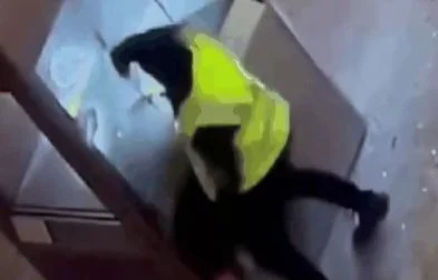 “Nas imagens, um homem utiliza uma máquina para cortar parte da estrutura de proteção e, em seguida, desfere golpes contra o vidro, tentando quebrá-lo.”
